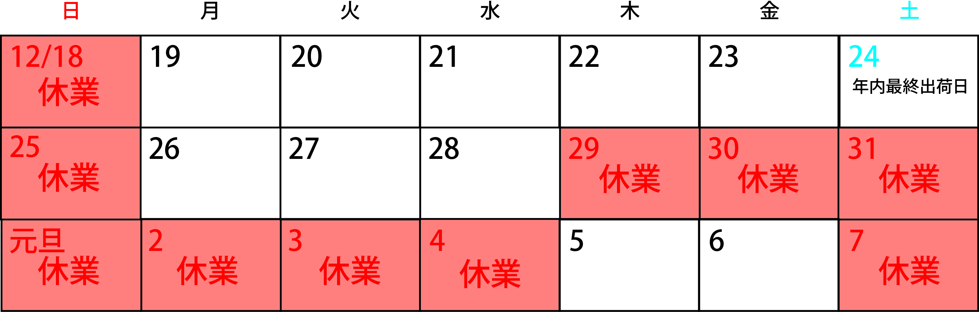 令和4年・5年 年末年始休業日のお知らせ 2022-12-01 誠に勝手ながら、弊社の年末年始休業日を下記のとおりとさせていただきます。 何卒ご了承くださいますようお願い申し上げます。(年内最終出荷日12月24日) カテゴリー お知らせ 新着情報一覧に戻る